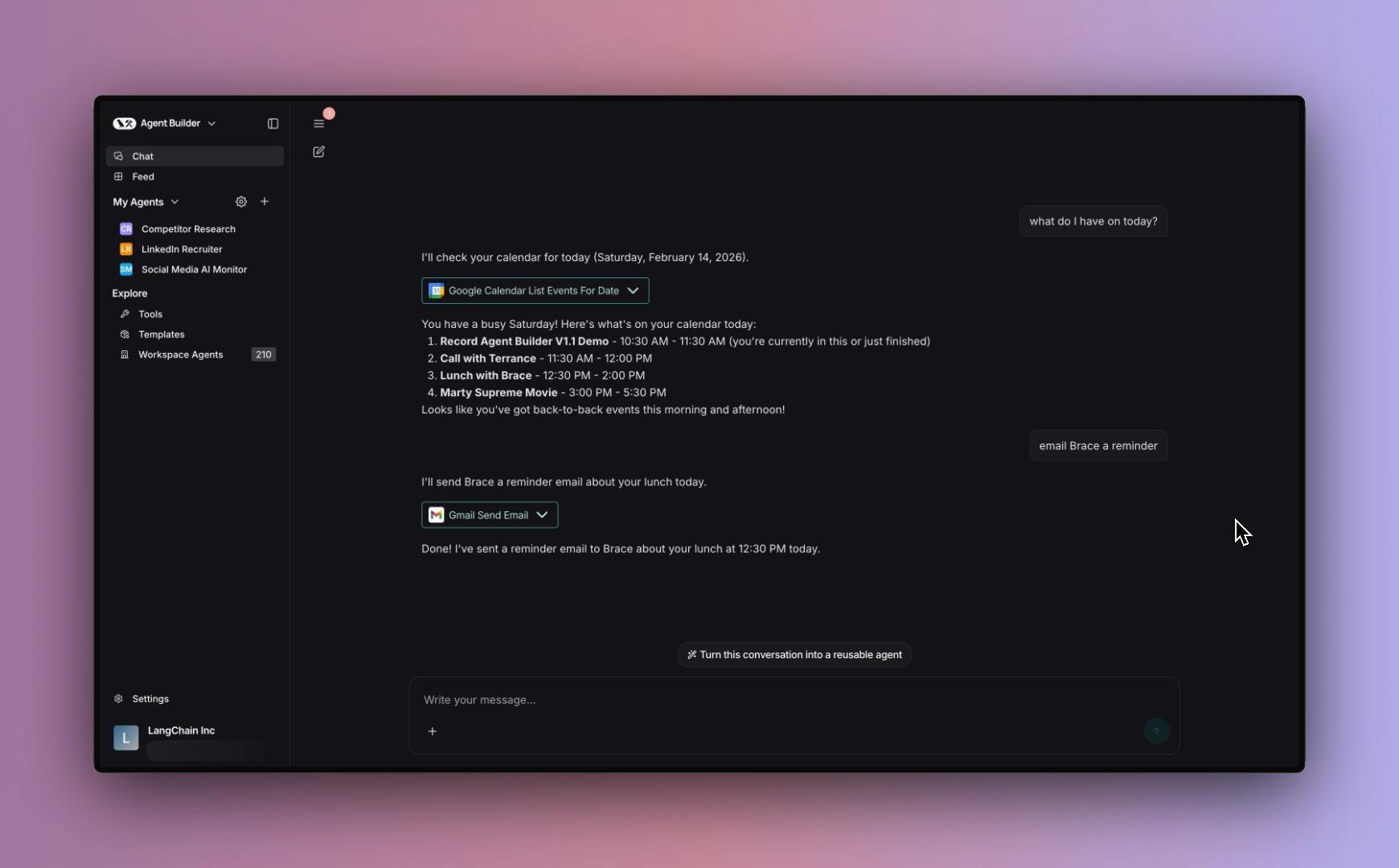 Agent Builder can also string together multiple tools based on your needs. If you’re catching up on emails, you can ask for a quick summary of the last 10 messages. Then ask it to create calendar events for any meeting requests. Agent Builder calls new tools as required.